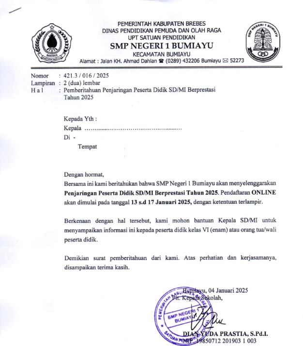 Berdasar SK Direktur Jenderal Pembinaan SMP Kemendikbud nomor 2989-D3-KP-2018, SMP Negeri 1 Bumiayu telah ditunjuk sebagai Sekolah Rujukan Nasional yang dituntut untuk selalu memberikan pelayanan sesuai Standar Pelayanan Minimal (SPM) serta harus selalu berpartisipasi aktif di setiap kegiatan dan berprestasi gemilang di setiap ajang. Untuk itulah, kami selalu membutuhkan dukungan, saran maupun kritik yang bersifat membangun dari semua pihak yang peduli dengan dunia pendidikan, sehingga SMP Negeri 1 Bumiayu akan semakin jaya.
